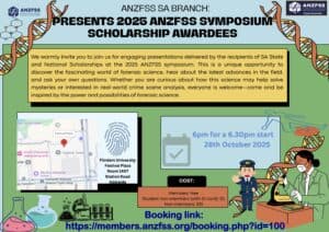 ​The ANZFSS SA Branch warmly invites you to join us for engaging presentations delivered by the receipients of the SA State and National Scholarships at the 2025 ANZFSS Symposium. This is a unique opporutnity to discover the fascinating world of forensic science, hear about the latest advances in the field, and ask your own questions. Whether you are curious about how this science may help solve mysteries or interested in real-work crime scene analysis, everyone is welcome – come and be inpsired by the power and possibilites of forensic science.